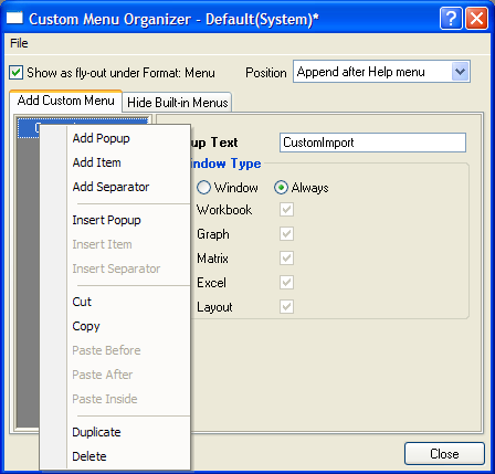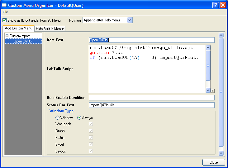 There are a few preparatory steps that should be undertaken into OriginLab in order to easily open the C files generated by QtiPlot. First of all you should create a new menu using the OriginLab Custom Menu Organizer wizard from the Tools menu: