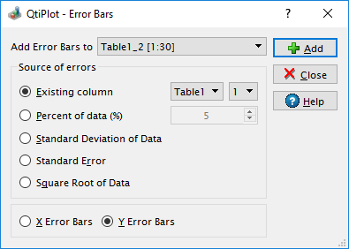 Note that clicking on the "Close" button will not add any error bars to the plot. You must set up the parameters for the error bars first and then click on the "Add" button. If you click on "Close" without clicking "Add", there will be no error bars drawn.