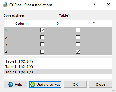 This dialog may be used to select the columns of the table to be used as X, Y and error values for the active curve.