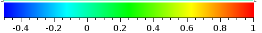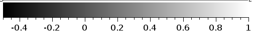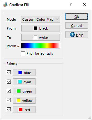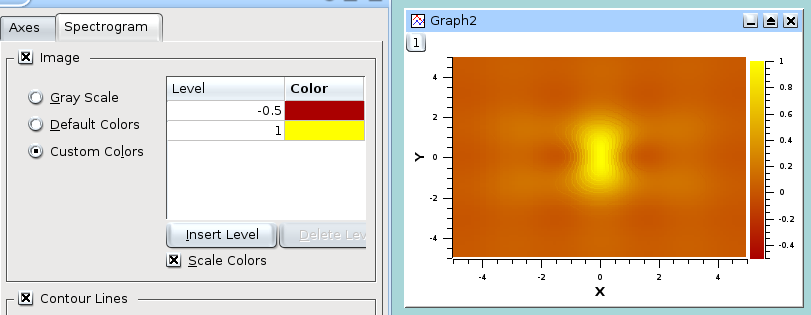 There are two groups of controls on this tab. Each group is activated by checking the box next to the group label. The first group of controls, labeled Image, are used to select the fill type of the contour plot. It is checked when filling of the contour plot is desired. If unchecked, no fill will be used. If filling is enabled, you may choose between gray-scale, a default color mapping and a custom color mapping with the 3 radio buttons. The default gray-scale and color maps are shown in the figure below.