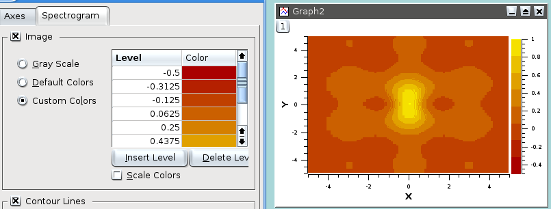 The Contour Lines tab is used to customize settings applicable to the contour lines. You can select the number of lines and their color. If you check Use Default Pen, the color of the lines will be defined by the settings in the group of controls to the left of the checkbox. If you check Use Color Map, the lines will be colored as a function of the Z levels from the colormap defined in the Colors setting tab. If you check Use Table Custom Pen, the color of the lines will be determined by the settings defined in the Pen column of the table displaying the Z levels.