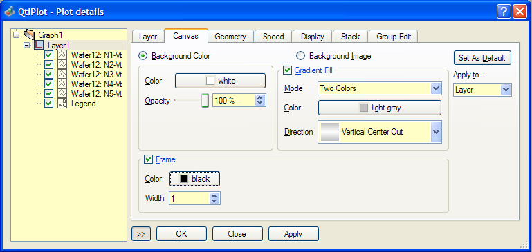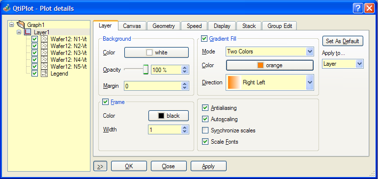 In the Layer tab you can define the style properties of the plot layer: the background color/gradient and the frame around it. You can also customize the behavior of the plot layer: enable/disable Antialiasing for the drawing of data curves, Autoscaling of the axes range when the data curves are modified and automatic resizing of the fonts when the size of the plot layer is changed by the user (Scale Fonts check box).