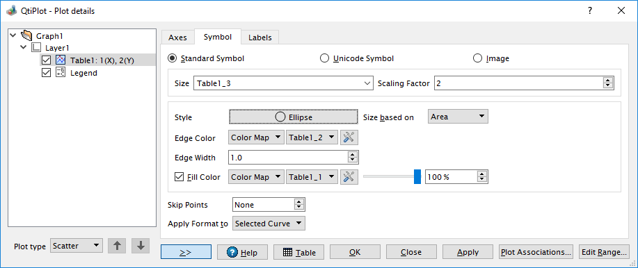 The Size drop-down list box may be used to select either a column that contains the size values for the plot symbols or a constant value. Alternatively you may type a custom constant size value. Units are measured in pixels. If the size values are taken from a table column, the Scaling Factor box becomes visible and its value may be used to proportionally increase or decrease the sizes of the plot symbols.