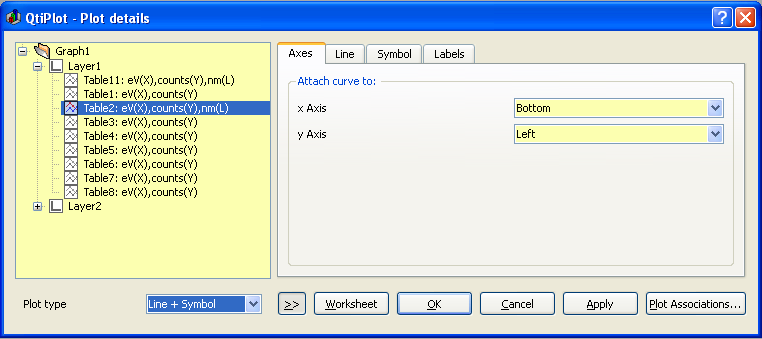 The Axes tab, the first tab on the right side of the dialog window, allows definition of the pair of axes to which a curve is attached. Attaching different curves on the layer to different X/Y axis pairs permits placing several curves with different x/y scales on the same plot layer.