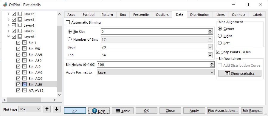 If you click the Show Statistics button from the Bin Worksheet control group, QtiPlot creates a table containing the computed quantities of the bins and the dialog is closed. You may check the Add Distribution Curve option in order to add the data used to create the overlayed distribution curve to this bin table.