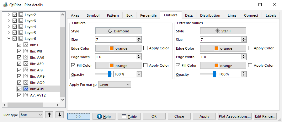 The controls available in this tab allow to easily modify the aspect of the plot symbols used for outliers and extreme values. If the value activated in the selection box Apply Format to is different than Selected Curve, all settings, except colors (for which you need to check the Apply Color boxes), are applied to all box curves from the active Layer, from all plot layers in the current Window or from all 2D plot windows, respectively.