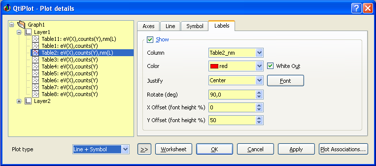 The Labels tab is used if you want labels plotted at each data point in the plot. Options are provided to control the font, color, rotation angle and position of these labels.