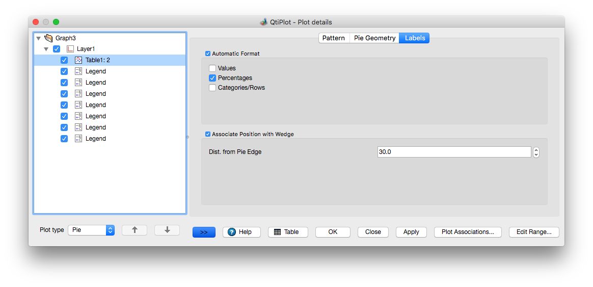 If the selected item is a plot curve than the Table, Plot Associations... and Edit Range... buttons become visible. Clicking the Plot Associations... button opens a dialog which can be used to select the columns of the table to be used as X and Y values for the active curve. Clicking the Edit Range... button opens a dialog which can be used to change the visible data range for the active curve. If the Table button is visible, it may be used to access to the table which contains the columns for the selected curve.