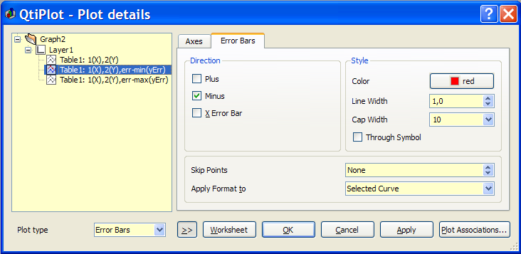 Using the controls in the Style group box you can customize the error bars in terms of color, line width, cap width and transparency. Finally, it is possible to tell QtiPlot to skip a number of data points when drawing the error bars by specifying a positive value in the Skip Points box.