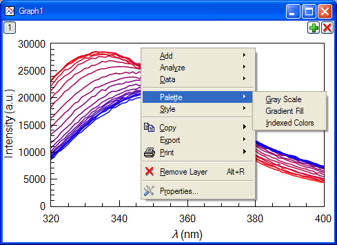The Gradient Fill box adds the possibility to apply a colour gradient to all plot curves. The line color, fill color and symbol color of all the data curves will be changed to a color in the user defined range going from Color 1 for the first curve of the plot layer to Color 2 for the last curve. This change can be applied to the current plot layer or to all the layers in the current graph window as well as to all 2D graph windows.