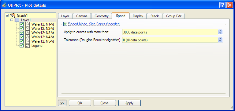 The Speed tab can be used to customize the speed mode for the layer. This can be very useful when dealing with very large data sets. Speed mode uses the Douglas and Peucker algorithm, the purpose of which is to take a 'curve' composed of line segments (or points) and find a new curve with fewer points that is not too dissimilar from the original curve. The algorithm defines 'not too dissimilar' as a function of the maximum distance (tolerance) between the original curve and the new curve. The new curve then consists of a subset of the line segments (or points) that defined the original curve. When the speed mode is enabled, filtering of the data is activated only for the curves with more than the specified maximum number of data points.