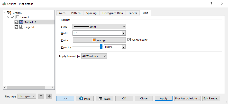 The title of this tab may be either Line or Pattern depending on the type of the selected plot curve. This tab allows customizing the style of the plot line (color, line style, thickness). The connect button allows changing the style which is used to draw the selected curve (steps, droplines, etc). See the Plot menu to see the different types of plots available.