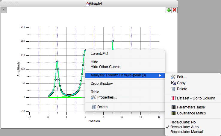 All the functionality provided by the controls in this dialog tab can be accessesd by right-clicking on a plot curve and selecting the Analysis item from the pop-up context menu.