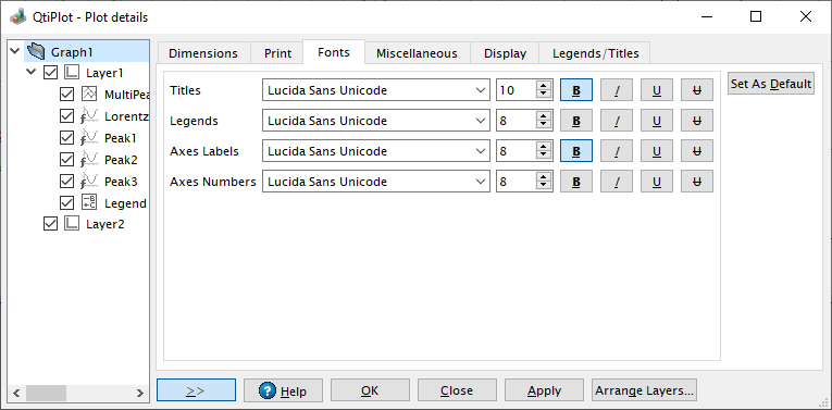 Using the controls in the Fonts tab you can customize with just a few clicks the fonts for various elements of all plot layers in the graph window.