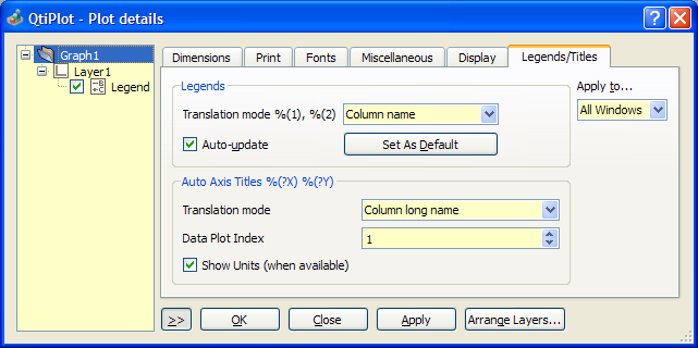 If the option Show Units (when available) is selected the contents of the table column's Unit property will be appended to the axis title. All these settings can be applied to the active graph or to all 2D plot windows in the project, depending on the option you choose in the Apply to... list box on the right side of this dialog tab.