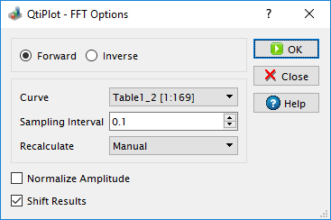 The FFT... dialog box can be used on a plot, on a table or on a matrix. It is used to compute either the direct or inverse FFT. See the FFT section in the Analysis chapter for an example.