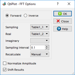 When performing an FFT on a table, you must select the sampling column (X-values) and one (for simple real values) or two (for complex values) columns of Y-values. Complex numbers have the real part of the Y-values in the first column and the imaginary part of the Y-values in the second column. If Y-values are simple reals, you don't have to select a column for the imaginary part. You can leave the combo box for the second column empty in this case.