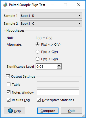 This dialog is activated by selecting the Paired Sample Sign Test... command from the Statistics -> Nonparametric Tests -> menu. It can be used in order to test for consistent differences between pairs of observations. The Wikipedia article on the sign test makes for excellent reading on this topic.