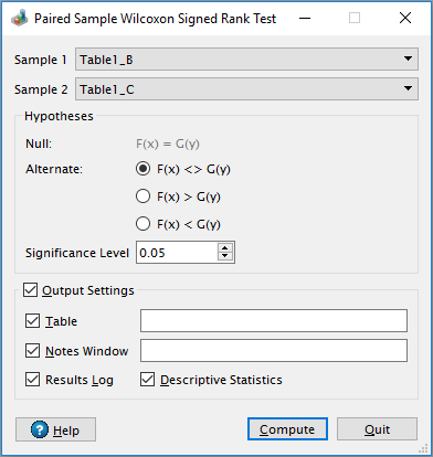 This dialog is activated by selecting the Paired Sample Wilcoxon Signed Rank Test... command from the Statistics -> Nonparametric Tests -> menu. It can be used in order to determine whether two dependent samples were selected from populations having the same distribution. The test procedure is explained in a Wikipedia article.