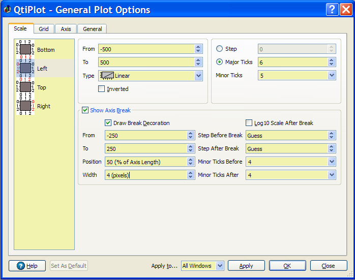 In this tab, you can set the number of ticks used for each axis. This can be done in two ways: 1) Set the number of labels to use for the entire scale. Whatever number you enter, QtiPlot may adjust the value so as to produce a prettier plot (for example, if you enter 7 ticks for a 0..100 scale, QtiPlot will use 10 major ticks spaced evenly from 10 to 100). 2) Set the Step Increment and QtiPlot will generate as many ticks as needed to fill the scale range using the indicated increment. This produces tick spacings and labels which are more like those that are typically done on hand drawn graphs.