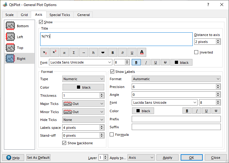 The third tab is used to modify the setting of the different axes. You must select the axis to be customized in the right window. The label of that axis can then be modified in the title window - see the text options dialog section for more details.