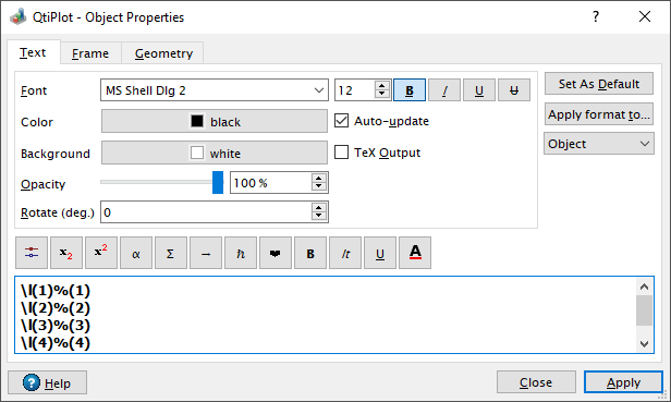 The following slightly modified dialog is opened when you double click on texts/legends in your plot in order to customize them. It also allows adding text boxes to a plot layer. When the text object is a legend (a listing of the curves plotted on the layer) the curve symbols and lines are also drawn in the text box, in front of the curve names. In order to display the symbol of a curve and the name of the data set, the following syntax is used: \l(1.2)%(1.2). In this example the first integer before the dot is the index of the plot layer and the second value, the number 2, refers to the index of the curve. The index of the layer is optional, if not specified, the parent layer is used.