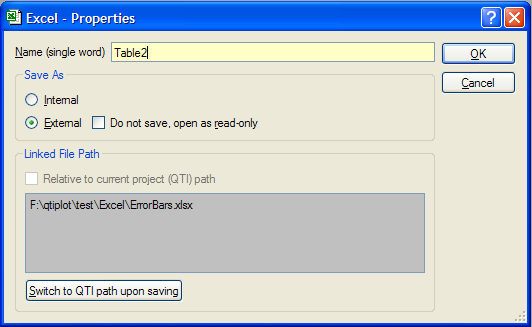 Excel specific options can be customised via the Properties dialog. The workbook can be saved as an external Excel file linked to the project or as an internal object in the QtiPlot project. If you choose to save it as an external link it is beneficial to save the Excel file in the same folder as the QtiPlot project or in a subfolder under it and then set Excel file path relative to QtiPlot project path to make them more portable.