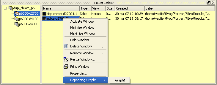 It gives an overview of the structure of a project and allows the user to perform various operations on the windows (tables, graphs, and notes) in the workspace: hiding, minimizing, closing, renaming, printing, etc. These functions can be reached via the context menu, obtained by right-clicking on an item in the explorer. When the cursor is moved over a graph or matrix item name a 256x256 preview of the window is displayed.