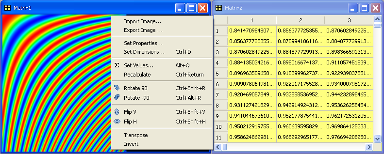 The matrix is a special table which is used for data which depends on two variables. This special table can be used to create 3D plots as well as 2D image/contour plots via the Plot 3D menu and the 3D plot toolbar. One difference between a table and a matrix is that matrices may function in one of two modes: they can display data in table form or they can display an image. Therefore matrices can be used as a basic image viewer and also as an image editor, since they implement some image manipulation functions like: 90 degrees rotation, horizontal and vertical mirroring, etc.