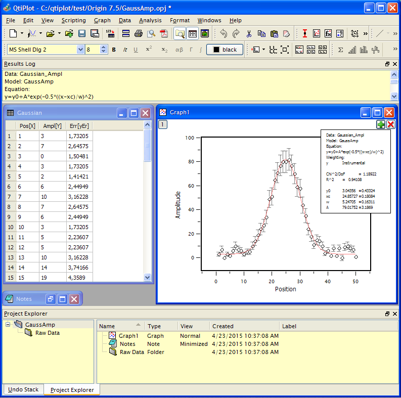 Several plots and all the data related to these plots can be saved in a project file. The project is therefore the main container of QtiPlot. The following screenshot gives an example of a typical session. This example shows the log panel at the top of the workspace, the project explorer at the bottom, plus a table and a plot window. Other windows are either docked or hidden.