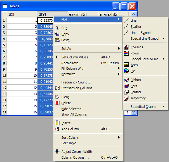 You can perform various operations on selected columns : fill with data, normalize, sort, view statistics and finally, generate curves from your data. All these functions can be reached by right clicking on the column label or by using the Table menu.
