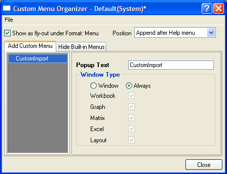 There are a few preparatory steps that should be undertaken into OriginLab in order to easily open the C files generated by QtiPlot. First of all you should create a new menu using the OriginLab Custom Menu Organizer wizard from the Tools menu: