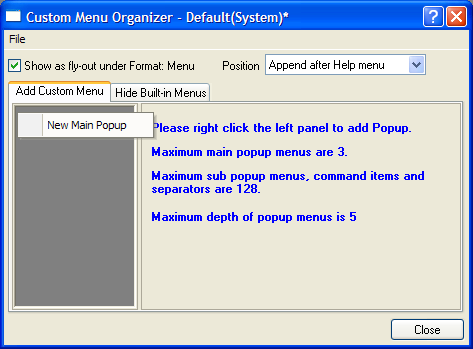 In the Custom Menu Organizer dialog you need to right click into the left panel in order to add a new menu, that was renamed to CustomImport in the example screenshot bellow: