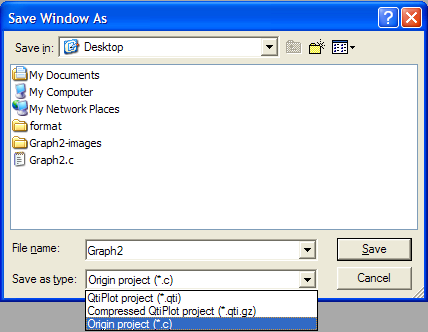Saving QtiPlot projects to Origin C files is straightforward: open the File menu, select the Save Window as... or Save Project as... command and choose the file type Origin project (*.c) from the file dialog.