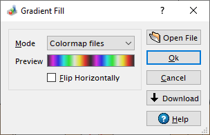 In the Colormap files mode, it is possible to select a color map stored in a .map file. The format of a .map file is very simple: it is a text file in which each line defines a color using the RGB color model. The red, green and blue components of a color must be integers between 0 and 255. Numbers should be separated by spaces. A colection of .map files can be downloaded by pressing the Download push button.
