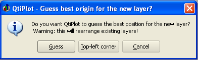 This dialog is opened when you add a new layer on the active plot. If you select Guess, QtiPlot will divide the window in two columns and put the new layer on the right. If you choose Top-Left Corner, QtiPlot will create a new layer with the maximum possible size and locate it on top of existing layers. The new layer contains an empty plotting area. You can subsequently modify the size and position of each layer by selecting it with the layer number buttons