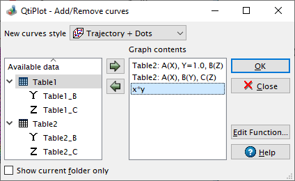 The left window shows the columns available from the project's tables that may be used for plotting. If the Show current folder only option is checked, only tables from the active folder of the project will be listed in this window. It is possible to sort the available tables/folders in alphabetical order by pressing the Available data column header. The right window lists the curves already plotted. In the case presented below, there are two tables that the Add/Remove Curves... dialog box lists for the selection of columns. You select a Y column to plot using this dialog. QtiPlot will use the column defined as X in the corresponding table for the X values.