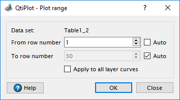 This dialog is activated by selecting the Edit Range... command from the Format Menu. It may also be activated by right-clicking on a plot curve and selecting Edit Range.... This dialog can be opened only if there is a selected data curve in the active plot layer.