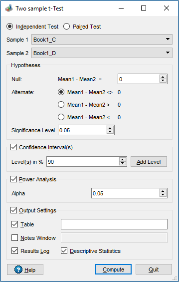 The two-sample form of the t-Test compares the difference between the means (m1-m2) of the two data sets to a mtest difference specified in the null hypothesis. Setting the test difference to 0 is equivalent to testing the equality of the means. By default QtiPlot performs a two-tailed test, the default alternate hypothesis being that the difference between means and mtest are different (m1-m2 <> mtest). It is also possible to perform an upper-tailed test by choosing the alternate hypothesis that m1-m2 > mtest or a lower-tailed test (m1-m2 < mtest).