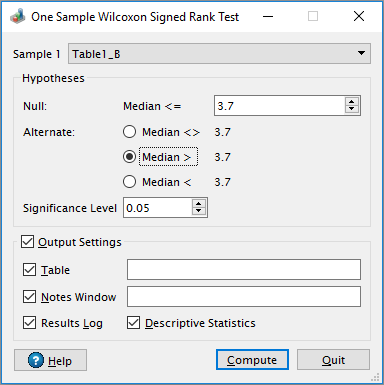 This dialog is activated by selecting the One Sample Wilcoxon Signed Rank Test... command from the Statistics -> Nonparametric Tests -> menu. It can be used as a non-parametric alternative to a one-sample t-test. The test determines whether the median of the data sample is equal to a specific value.