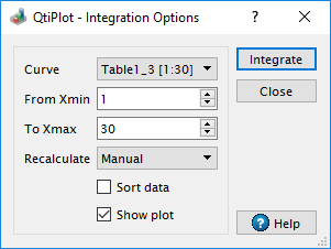 This dialog box is opened when you select the Integrate... command from the Analysis menu. The dialog displays a different set of controls depending if you are integrating data from a table or from a plot curve.
