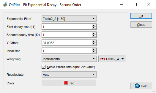 This dialog box is opened when you select the Fit Exponential Decay -> Second Order... command from the Analysis -> Fitting menu. It allows to choose the curve to fit, the initial guesses for the fit parameters and the weighting method.