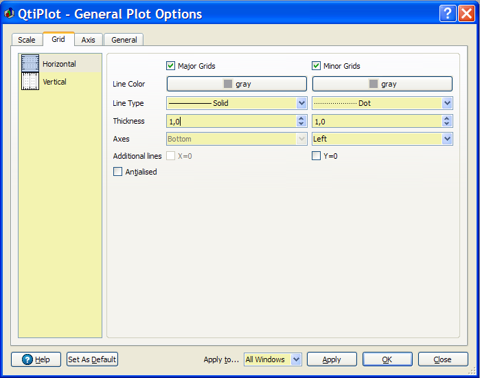The grid tab is used to draw grid lines on the plot. The frequency of the lines are related to the number of labels and major ticks set with the Scale tab.