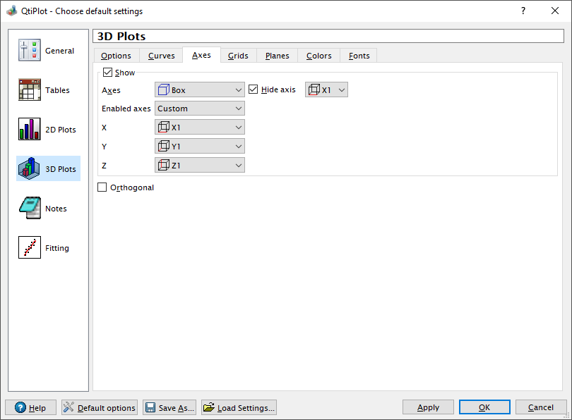 The first page in this section is the Options tab, which allows to set a default size for 3D plot windows as well as default rotation angles around the three axes. Please note that the default size is the canvas size, it doesn't include the window frame.