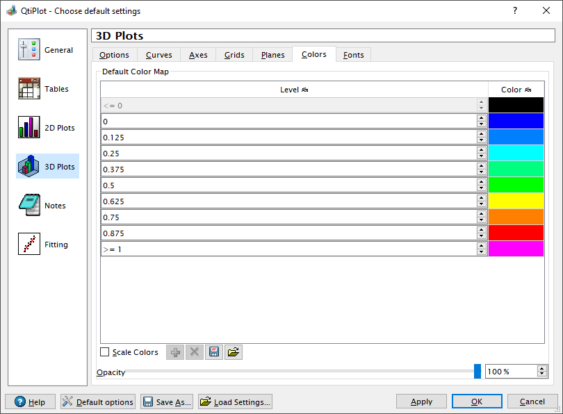 The Colors tab makes possible to define a default color map to be used for rendering 3D surfaces with style set to Polygon only or Mesh + Filled polygons and for the symbols of 3D curves.