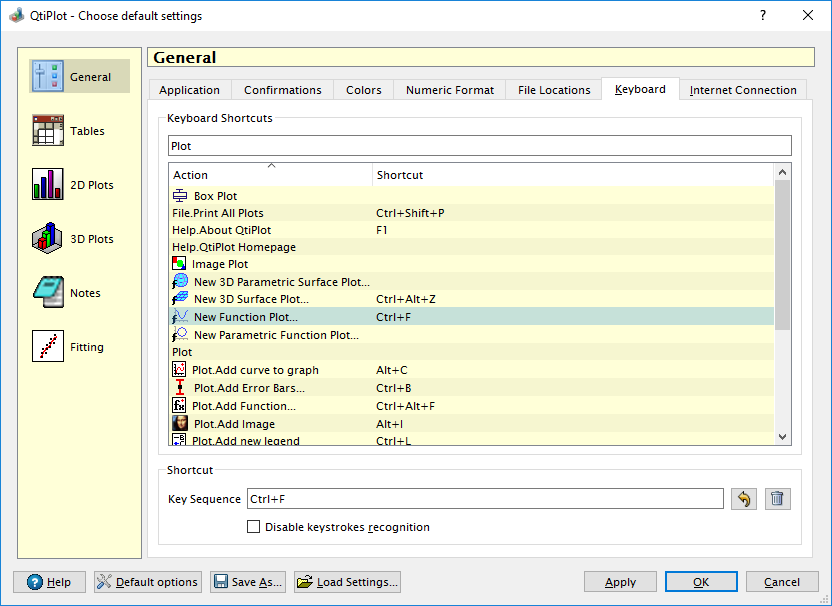 The Keyboard tab makes possible to define custom shortcuts for all actions in the menus and toolbars of QtiPlot.