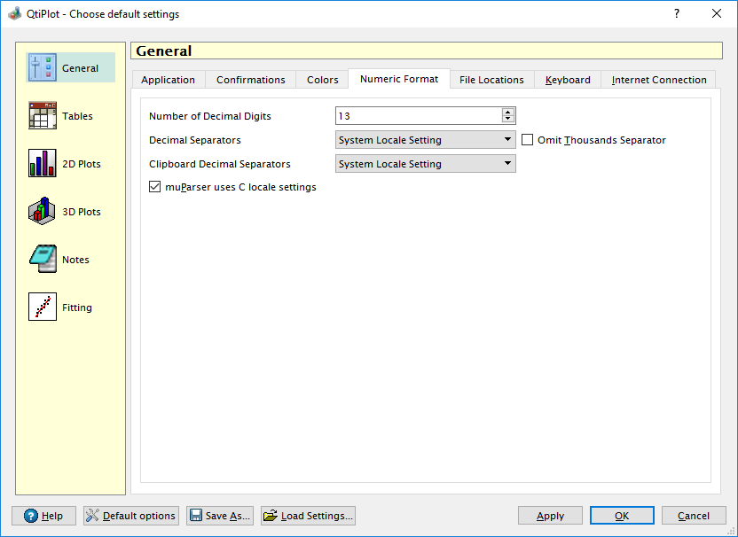 If the option muParser uses C locale settings is checked operations like setting column/matrix values or plotting function curves require that all the data input parameters are written using the standard convention for the C programming language: the decimal point is the dot character and the thousands separator is omited. Uncheck this option in order to use the numeric format settings specified above.