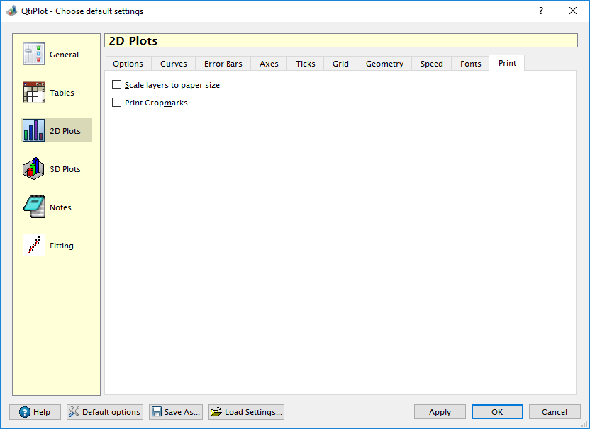 The Print tab allows you to control a few default options that are used when printing 2D plots. If you want layers to be printed with their original dimensions, you must be sure to uncheck the Scale layers to paper size option. Checking the Print Cropmarks option ensures that some visible marks will be drawn around the borders of the plot.