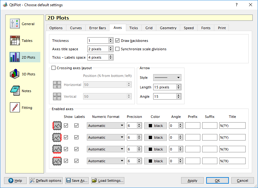 The Enabled axes panel controls which axes and more precisely which axes elements will be visible in a new plot layer. With the use of the Show check box it is possible to enable/disable a plot axis. The display of the major tick labels is controlled with the Labels check box. If you want to disable the display of an axis title you simply remove the text in the Title edit box.