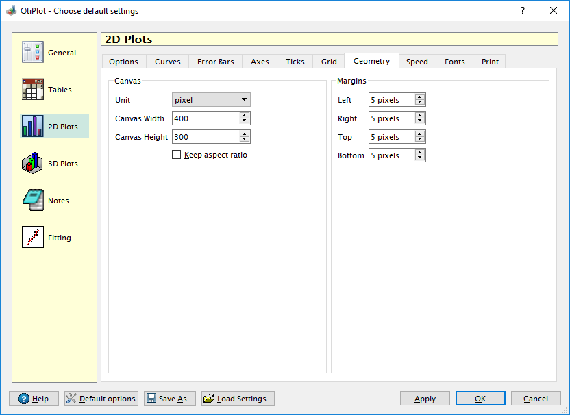 The Geometry tab defines the default size for the drawing area of a plot layer and the margins around the layers. When the Keep aspect ratio option is checked, changing either the width or height will proportionally change the other dimension. Also, the aspect of the plot canvas (ratio between width and height) will remain unchanged for all future plot layers when you manually resize a graph window.